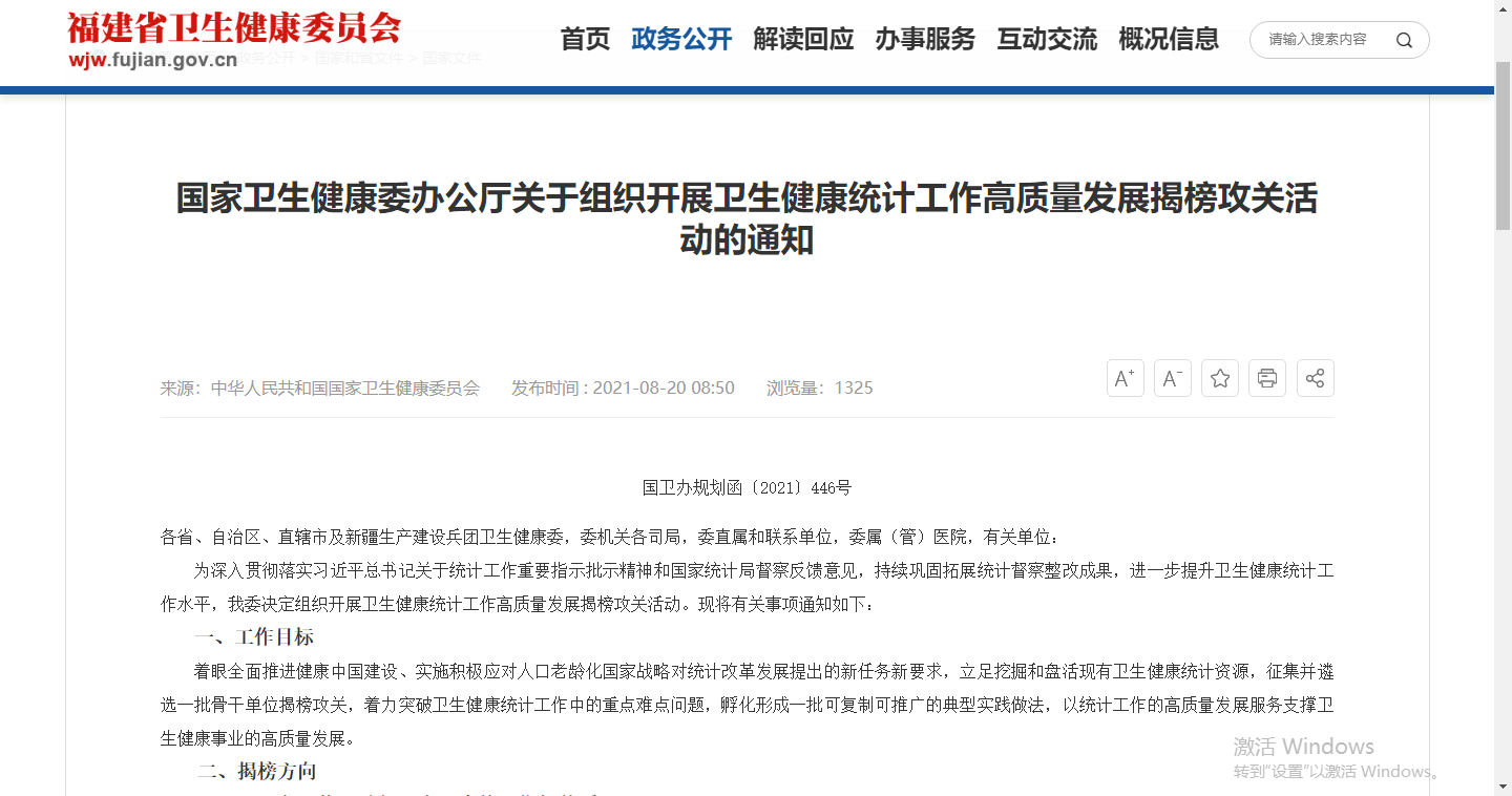 為深入貫徹落實習近平總書記關于統計工作重要指示批示精神和國家統計局督察反饋意見,持續鞏固拓展統計督察整改成果,進一步提升衛生健康統計工作水平,我委決定組織開展衛生健康統計工作高質量發展揭榜攻關活動。現將有關事項通知如下: