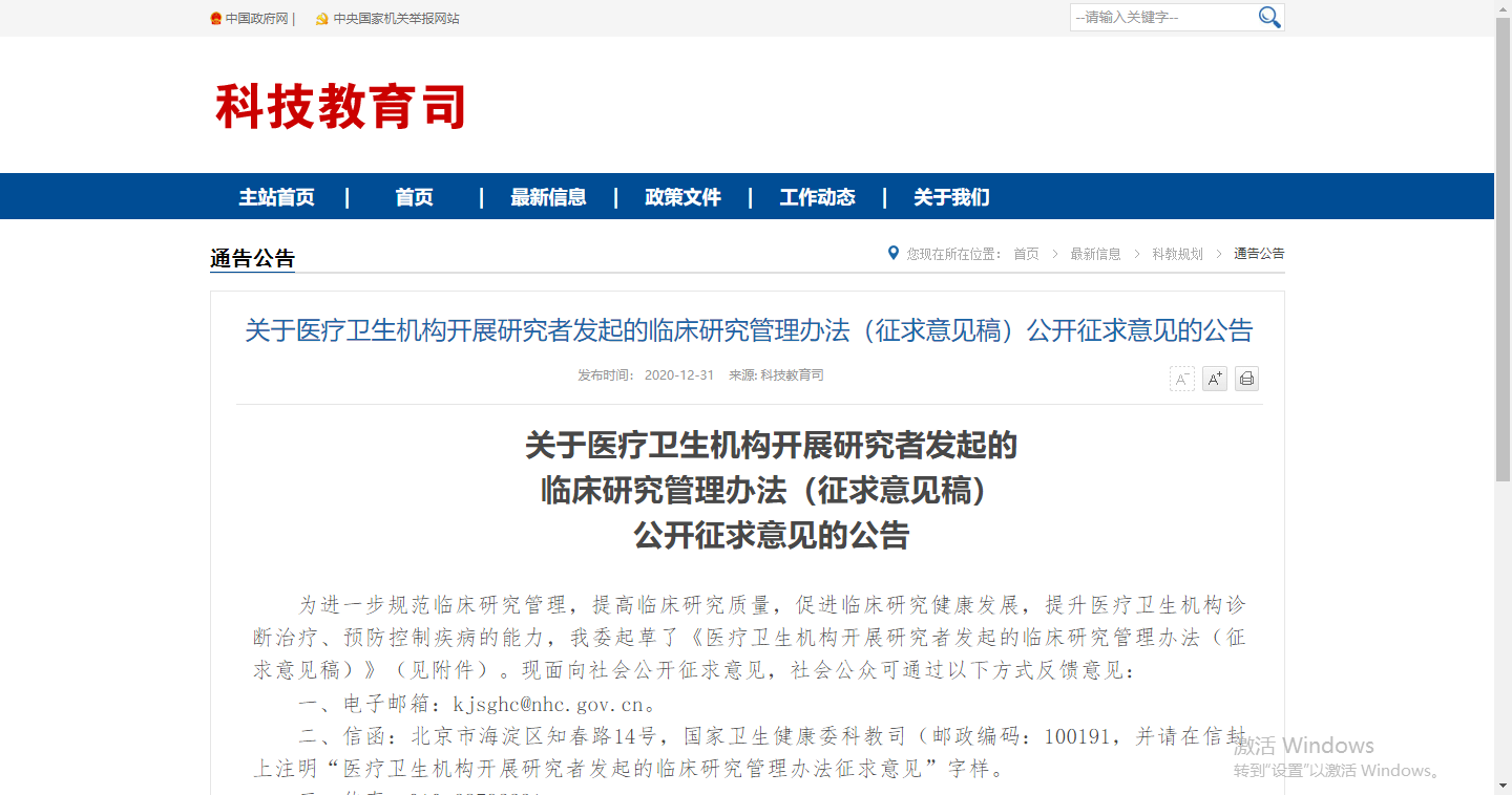 為進一步規范臨床研究管理,提高臨床研究質量,促進臨床研究健康發展,提升醫療衛生機構診斷治療、預防控制疾病的能力,我委起草了《醫療衛生機構開展研究者發起的臨床研究管理辦法(征求意見稿)》(見附件)。現面向社會公開征求意見,社會公眾可通過以下方式反饋意見: