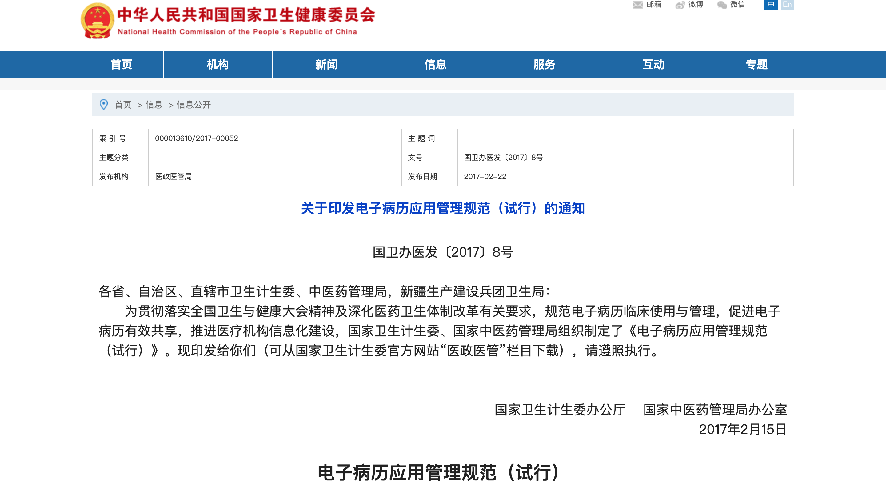 為貫徹落實全國衛生與健康大會精神及深化醫藥衛生體制改革有關要求,規范電子病歷臨床使用與管理,促進電子病歷有效共享,推進醫療機構信息化建設,國家衛生計生委、國家中醫藥管理局組織制定了《電子病歷應用管理規范(試行)》。