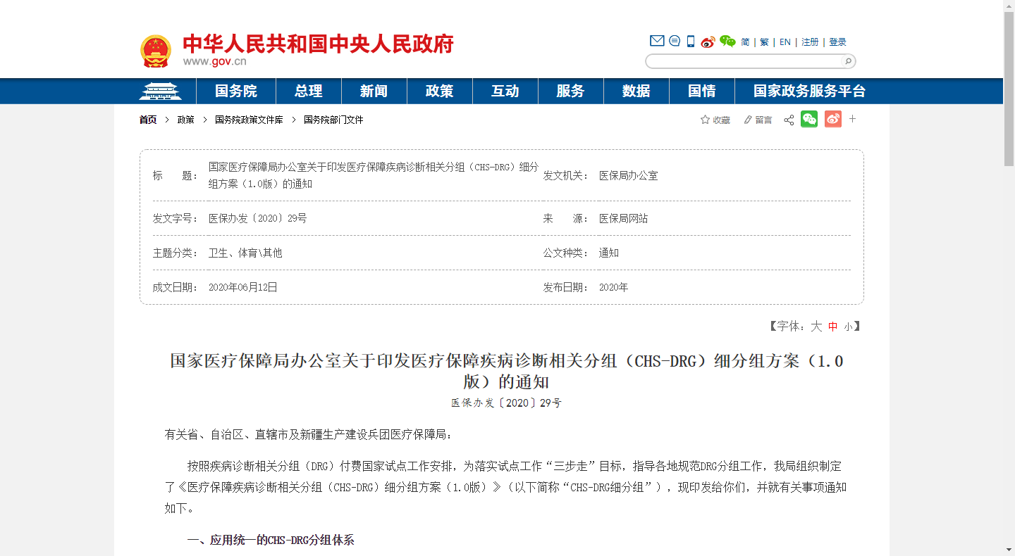 國家醫療保障局辦公室制定了《醫療保障疾病診斷相關分組(CHS-DRG)細分組方案(1.0版)