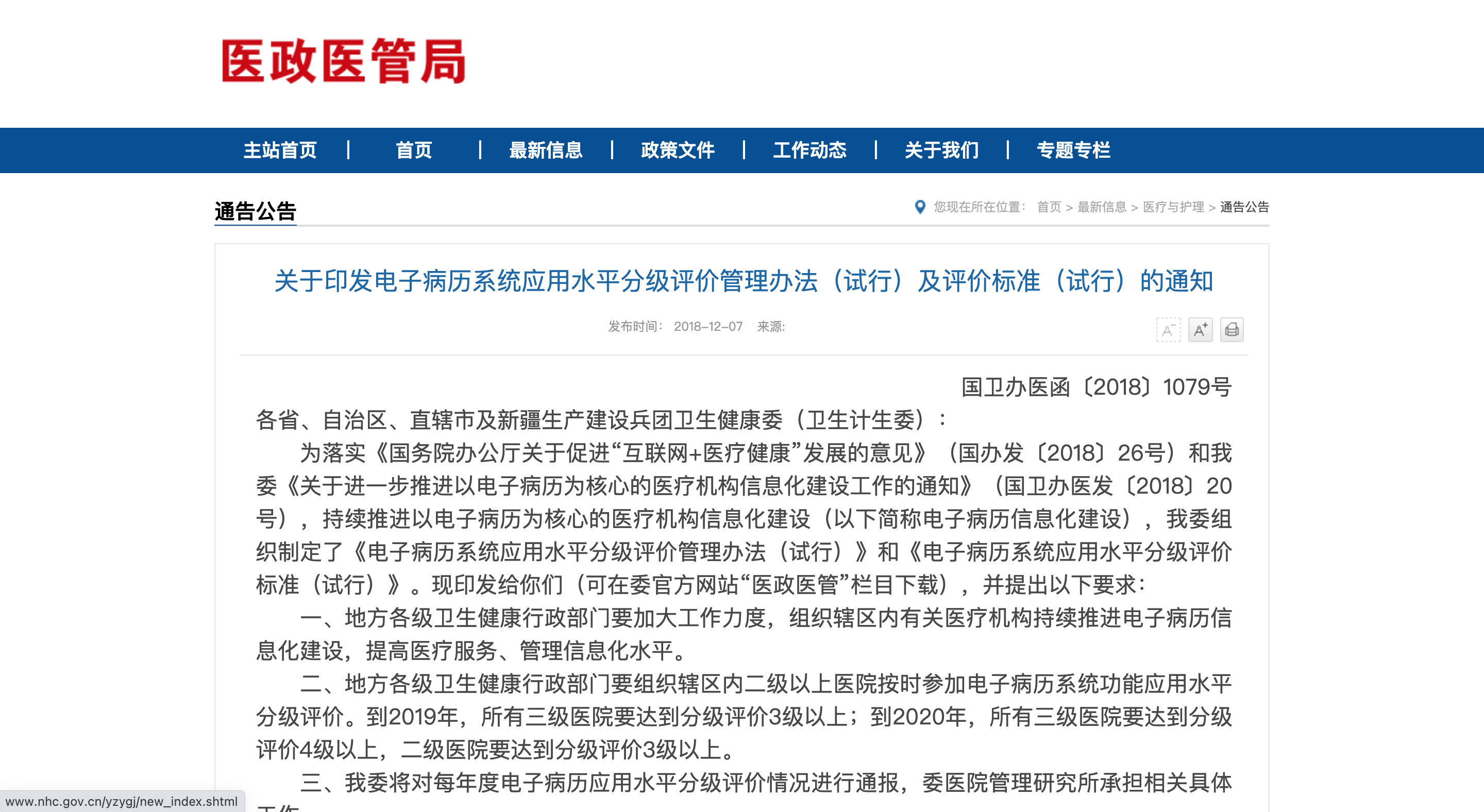 為落實《國務院辦公廳關于促進“互聯網+醫療健康”發展的意見》和《關于進一步推進以電子病歷為核心的醫療機構信息化建設工作的通知》,持續推進以電子病歷為核心的醫療機構信息化建設,制定了《電子病歷系統應用水平分級評價管理辦法(試行)》