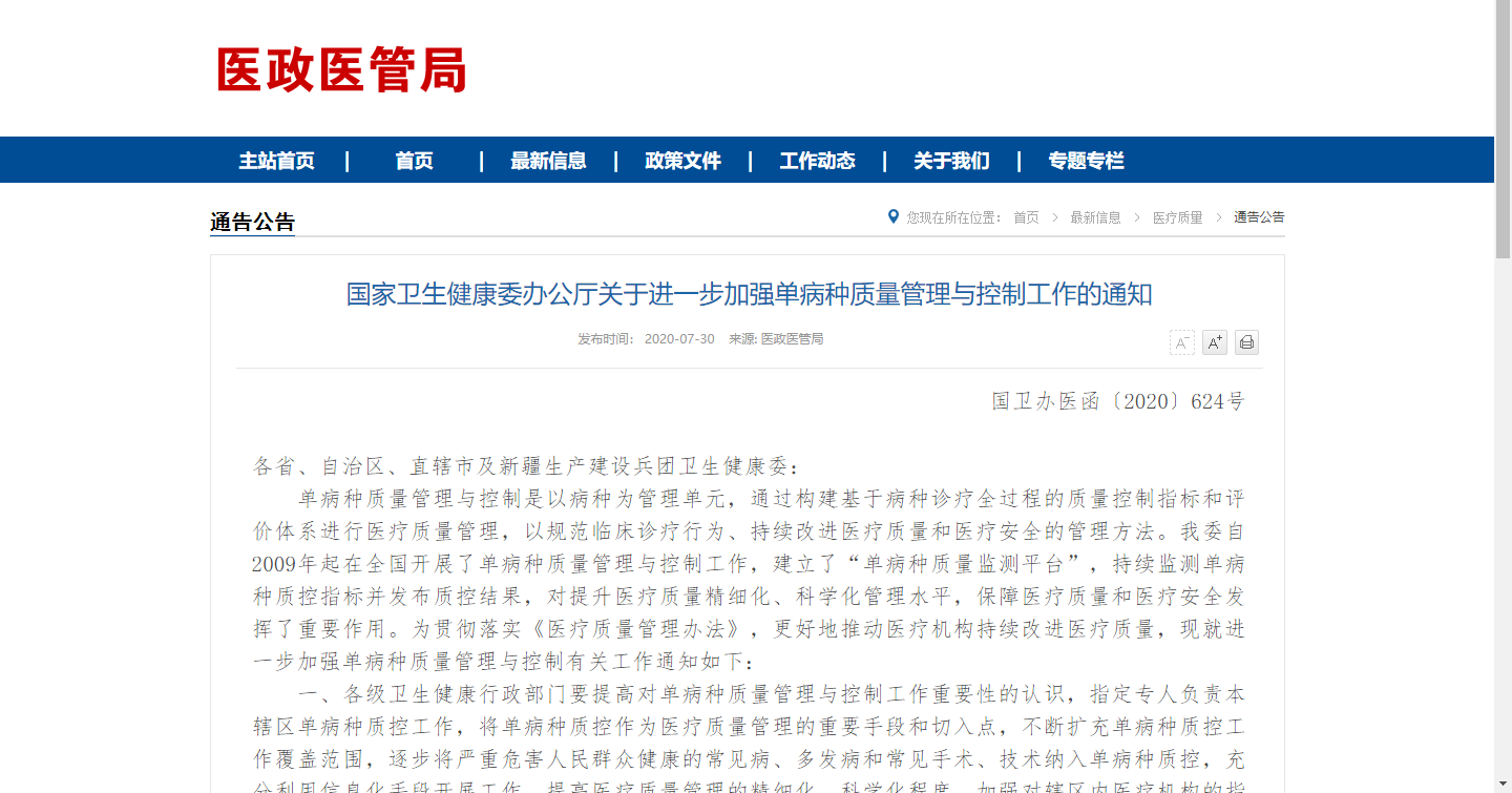 為貫徹落實《醫療質量管理辦法》,更好地推動醫療機構持續改進醫療質量,現就進一步加強單病種質量管理與控制有關工作通知