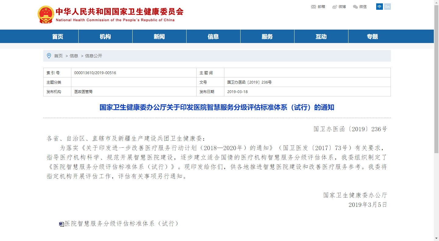 為落實《關于進一步完善預約診療制度加強智慧醫院建設的通知》有關要求,指導醫療機構科學、規范開展智慧醫院建設,提升醫院管理精細化、智能化水平,國家衛健委組織制定了《醫院智慧管理分級評估標準體系(試行)》
