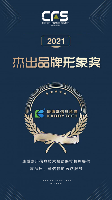本次獎項由CFS第十屆中國財經峰會組委會發起,通過企業自薦及多類第三方推薦通道選出候選代表,并邀請知名機構、咨詢公司、學者及媒體組成評審委員會,依據“創新、責任、影響力、推動力、成長性、前瞻性”六個指標評審而成,共設置24類大獎,著重選擇在未來經濟中有引領作用的優質企業、潛力行業及精英領袖。康博嘉憑借在醫療信息化領域深厚的耕耘經驗及創新發展的勢頭突圍而出,與圓心科技、科大訊飛、OSIM傲勝等公司共列于獲獎企業名單。