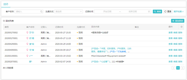 醫(yī)療機構可以通過康博嘉醫(yī)院CRM進行預約及排班管理,可以查看到院、離院、失約等預約視圖,查看含有客戶名稱、電話、預約時間、預約資源等信息的預約列表。還可以查詢消息發(fā)送記錄、接收人、預計和實際發(fā)送時間、發(fā)送狀態(tài)、是否已讀等信息。其中,銷售回訪對醫(yī)療機構拉進與客戶之間的距離起到關鍵作用。