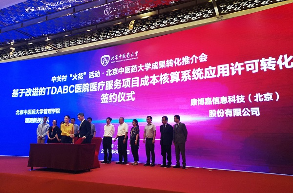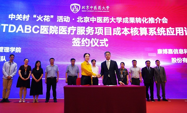 6月25日,在北京中醫藥大學校長徐安龍,北京市科委會副主任劉暉、北京市中醫管理局局長屠志濤等領導共同見證下,康博嘉信息科技與北京中醫藥大學管理學院程薇教授團隊達成基于改進的TDABC醫院醫療服務項目成本核算系統應用許可轉化,將基于改進的TDABC數據模型應用于康博嘉HRP系統,實現北京中醫藥大學社科類首例成果轉化。