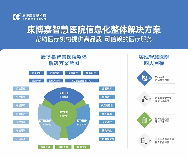 康博嘉信息科技專注以提高醫療機構經營效能為己任,提供基于信息化技術及數據價值的智慧醫院整體解決方案,包括智慧醫療 HIS系統、智慧管理 HRP系統、智慧服務醫院CRM、智慧平臺 IIP。