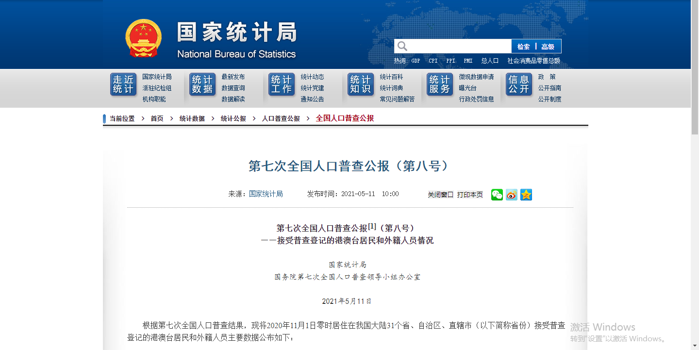 2021年5月11日,國家統計局公布了第七次全國人口普查主要數據結果:全國人口總數14.12億人,2020全年出生人口1200萬人,人口出生率為8.50‰,出生率為1952年以來歷史新低。