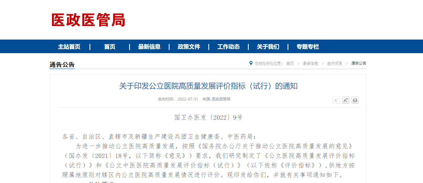 為進一步推動公立醫院高質量發展,按照《國務院辦公廳關于推動公立醫院高質量發展的意見》(國辦發〔2021〕18號,以下簡稱《意見》)要求,我們研究制定了《公立醫院高質量發展評價指標(試行)》和《公立中醫醫院高質量發展評價指標(試行)》(以下統稱《評價指標》),供地方按照屬地原則對轄區內公立醫院高質量發展情況進行評價。現印發給你們,并就有關事項通知如下。