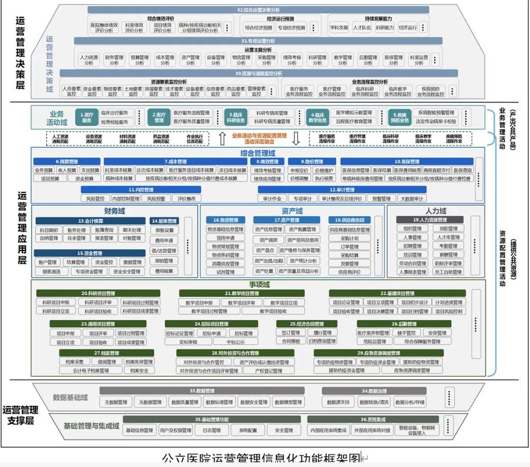 公立醫院運營信息化功能框架圖大篇幅展示了綜合管理域、財務域、資產域、人力域、事項域的功能模塊,是對《關于加強公立醫院運營管理的指導意見》(國衛財務發〔2020〕27號)(下稱《意見》)文件中“明確運營管理重點任務”的信息化落地。