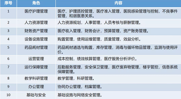 《通知》顯示,該體系將醫院管理業務劃分為10大類角色,每一角色又細分出數項業務,共計33項。