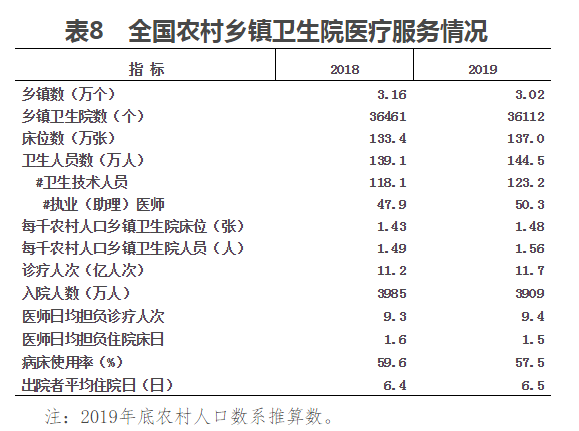 2019年底,全國3.02萬個鄉鎮共設3.6萬個鄉鎮衛生院,床位137.0萬張,衛生人員144.5萬人(其中衛生技術人員123.2萬人)。與上年比較,鄉鎮衛生院減少349個(鄉鎮撤并后衛生院合并),床位增加3.6萬張,人員增加5.4萬人。2019年,每千農村人口鄉鎮衛生院床位達1.48張,每千農村人口鄉鎮衛生院人員達1.56人(見表8)。