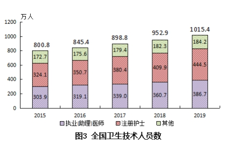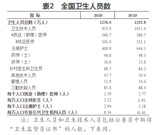 (三)衛生人員總數。2019年末,全國衛生人員總數達1292.8萬人,比上年增加62.8萬人(增長5.1%)。