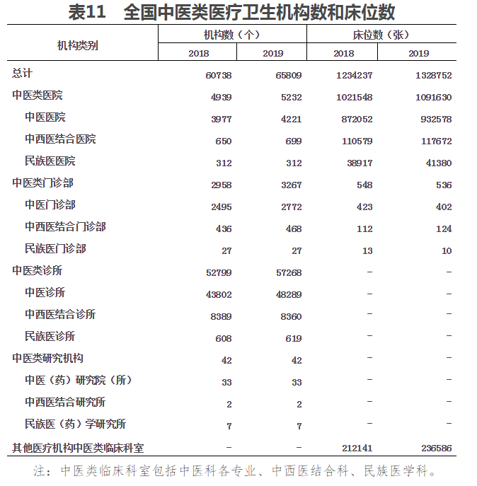 (一)中醫類機構、床位及人員數。2019年末,全國中醫類醫療衛生機構總數達65809個,比上年增加5071個。其中:中醫類醫院5232個,中醫類門診部、診所60535個,中醫類研究機構42個。與上年比較,中醫類醫院增加293個,中醫類門診部及診所增加4778個(見表11)。