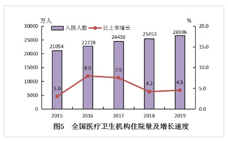 2019年,全國醫療衛生機構入院人數26596萬人,比上年增加1143萬人(增長4.5%),年住院率為19.0%。