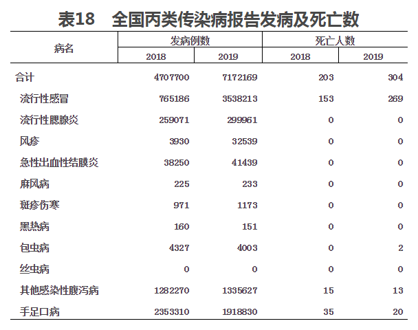2019年,全國丙類傳染病除絲蟲病無發病和死亡病例報告外,其余10種共報告發病717.2萬例,死亡304人。報告發病數居前5位的病種依次為流行性感冒、手足口病、其他感染性腹瀉病、流行性腮腺炎和急性出血性結膜炎,占丙類傳染病報告發病總數的99.5%。報告死亡數較多的病種依次為流行性感冒、手足口病和其他感染性腹瀉病,占丙類傳染病報告死亡總數的99.3%(見表18)。