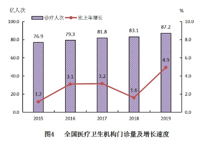 (一)門診和住院量。2019年,全國醫療衛生機構總診療人次達87.2億人次,比上年增加4.1億人次(增長4.9%)。2019年居民到醫療衛生機構平均就診6.2次。