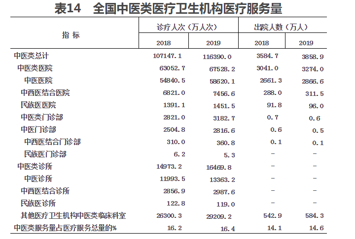 (二)中醫醫療服務。2019年,全國中醫類醫療衛生機構總診療人次達11.6億人次,比上年增加0.9億人次(增長8.6%)。其中:中醫類醫院6.8億人次(占58.0%),中醫類門診部及診所2.0億人次(占16.9%),其他醫療機構中醫類臨床科室2.9億人次(占25.1%)。