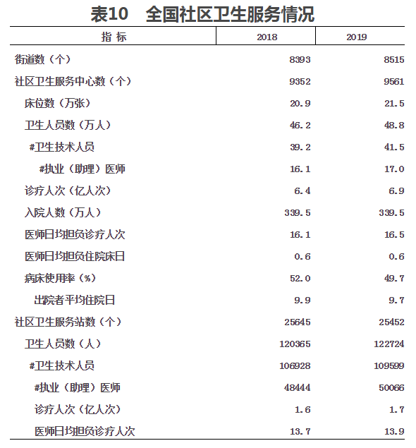 2019年,全國社區衛生服務中心診療人次6.9億人次,入院人數339.5萬人;平均每個中心年診療量7.2萬人次,年入院量355人;醫師日均擔負診療16.5人次和住院0.6床日。2019年,全國社區衛生服務站診療人次1.7億人次,平均每站年診療量6603人次,醫師日均擔負診療13.9人次(見表10)。