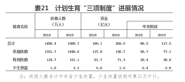 (二)計劃生育家庭獎勵和扶助政策。2019年計劃生育家庭獎勵和扶助“三項制度”共投入資金209億元,比上年增加18.9億元;農村部分計劃生育家庭獎勵扶助制度受益1448.6萬人;計劃生育家庭特別扶助制度受益151.1萬人,西部地區“少生快富”工程受益3.2萬戶。