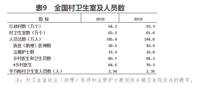 2019年底,全國53.3萬個行政村共設61.6萬個村衛生室。村衛生室人員達144.6萬人,其中:執業(助理)醫師43.5萬人、注冊護士16.8萬人、鄉村醫生和衛生員84.2萬人。平均每村衛生室人員2.35人。與上年比較,村衛生室數減少0.6萬個,人員總數有所減少(見表9)。