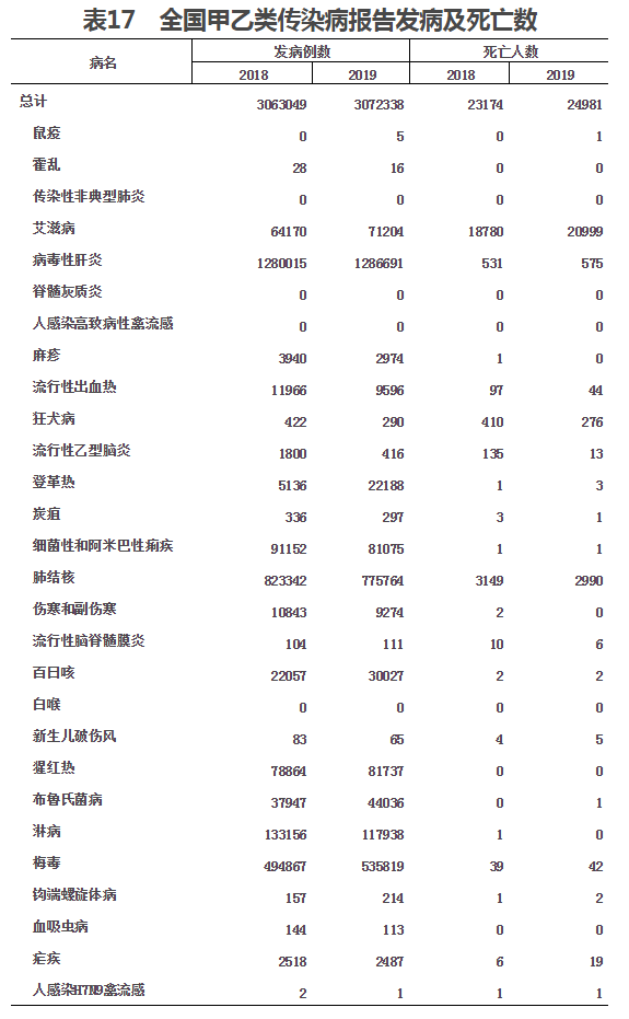 (一)傳染病報告發病和死亡。2019年,全國甲、乙類傳染病報告發病307.2萬例,報告死亡24981人。報告發病數居前5位的是病毒性肝炎、肺結核、梅毒、淋病和猩紅熱,占甲乙類傳染病報告發病總數的91.1%。報告死亡數居前五位的是艾滋病、肺結核、病毒性肝炎、狂犬病和流行性出血熱,占甲乙類傳染病報告死亡總數的99.6%(見表17)。