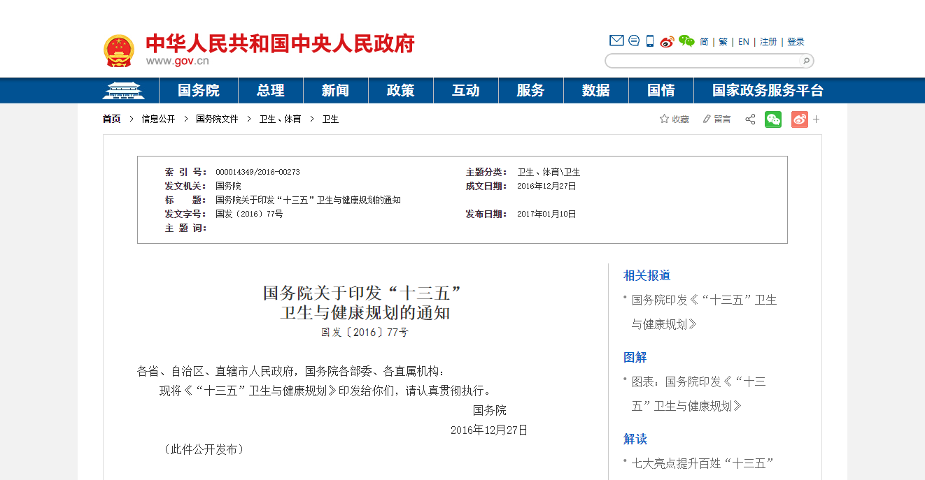 各省、自治區、直轄市人民政府,國務院各部委、各直屬機構:現將《“十三五”衛生與健康規劃》印發給你們,請認真貫徹執行。
