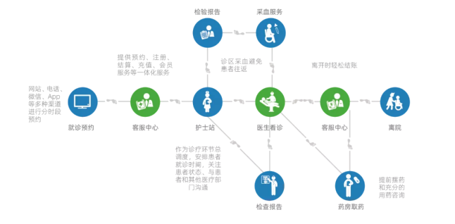 通過康博嘉研發的醫院信息系統,可以將傳統的就診模式轉變為更高效的先診療后付費的就診流程,即通過網站、電話、微信、App等多種渠道進行分時段預約,采取實時信息通知、提前擺藥、條碼應用、互聯網支付等手段,使診療流程更順暢、更合理。