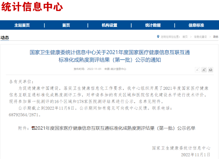 近日,國家衛健委統計信息中心發布了《2021年度國家醫療健康信息互聯互通標準化成熟度測評結果(第一批)公示》,將參加第一批測評的16個區域和178家醫院測評結果進行公示。