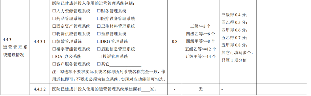 醫院互聯互通測評方案中,還明確提出要關注運營管理系統的建設情況,通過三級、四級乙等、四級甲等、五級乙等、五級甲等測評的醫院分別需要滿足3個、6個、8個、12個、14個的數量需求。