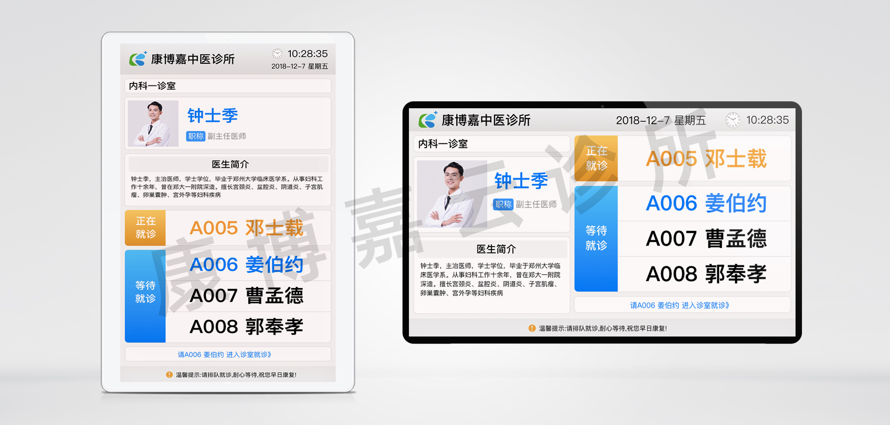 另外,云診所管理系統最近還升級了叫號服務功能,在診室門口,也有小屏可以展示當前診室的醫生信息和患者排隊情況。
