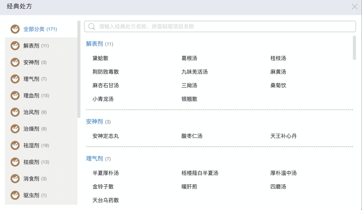 第2步,在經(jīng)典處方集中,醫(yī)生可以根據(jù)功用、治法或搜索快速定位所需處方,醫(yī)生用鼠標(biāo)懸浮在處方名上時(shí),即可查看該處方組成: