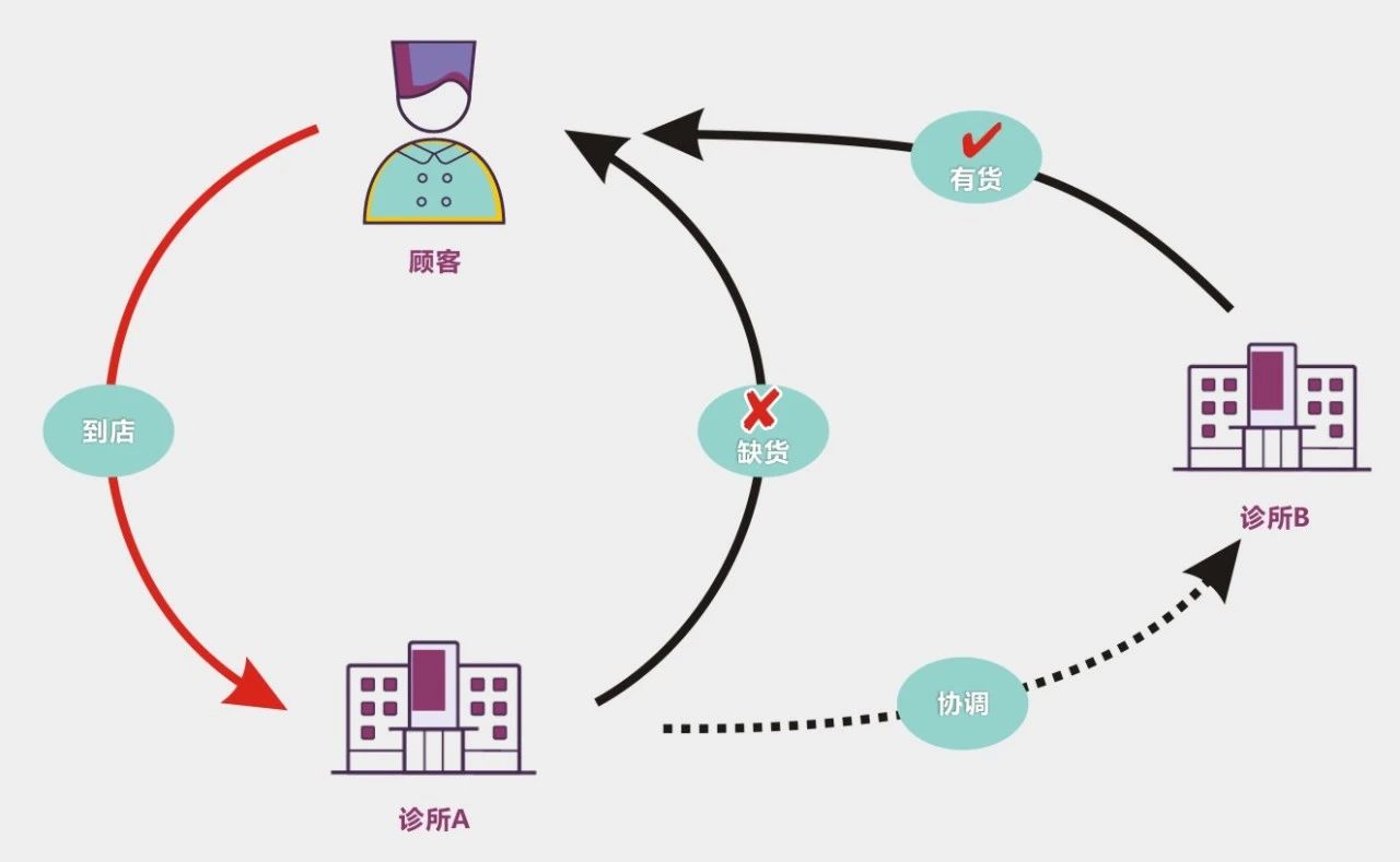 線下的連鎖診所,碰到個(gè)別藥品庫(kù)存暫缺的情況,為避免客戶的流失,可以選擇到庫(kù)存尚有盈余的連鎖店面調(diào)用救急。