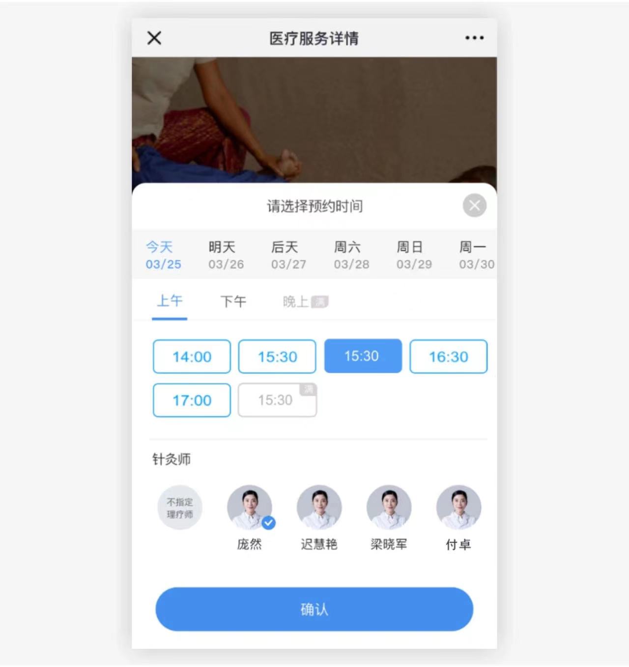 診所顧客可以在微信上預約醫療服務。在【預約服務】板塊挑選服務項目后,根據需求選擇預約時間和自己喜歡的治療師。