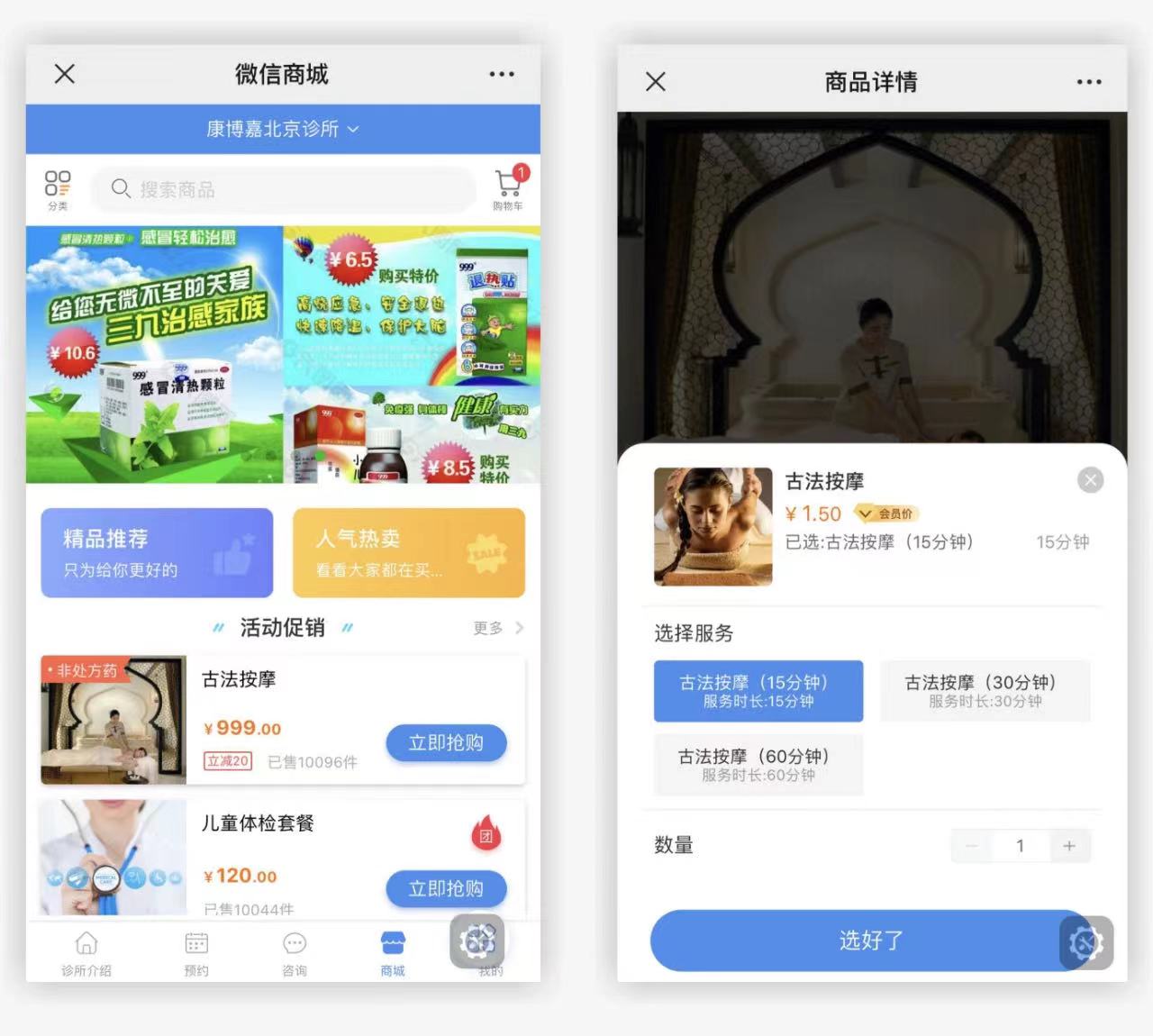 康博嘉云診所門診管理系統也提供【微信商城】功能,讓診所顧客也可以像購買傳統醫療商品一樣選購服務項目。