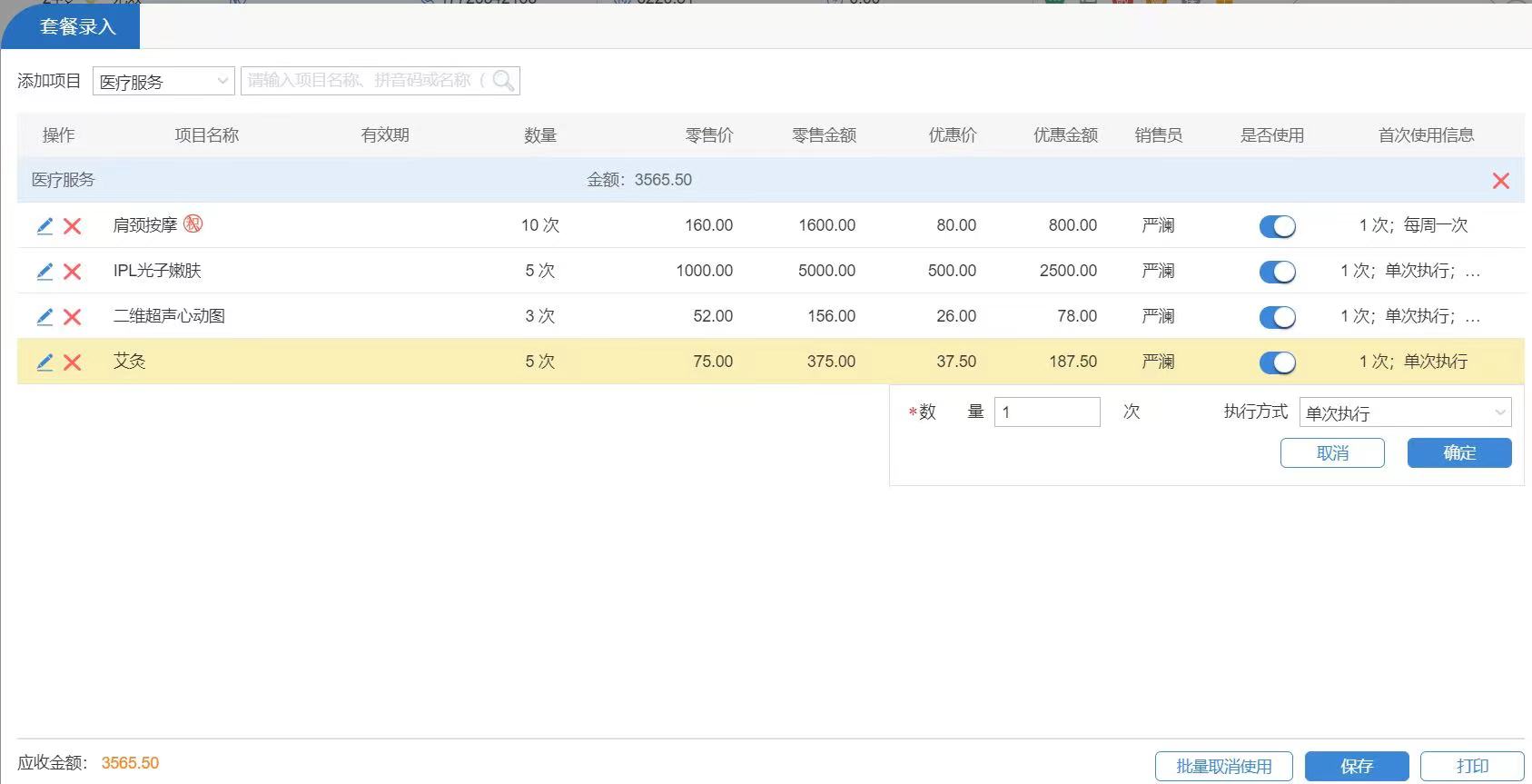 醫生在給患者開立醫囑時,可以推薦合適的服務項目。通過門診管理系統中的【醫生工作站】中的【醫療服務】板塊,醫生可以直接為患者錄入相關項目,并同步填寫醫囑執行信息。