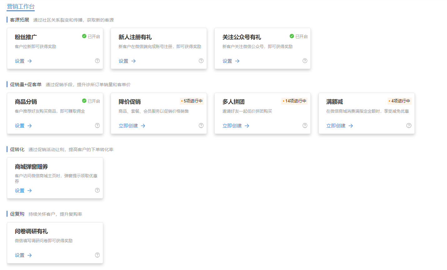 診所可以在【營銷中心】進行相關操作。打開【營銷工作臺】,可以一目了然地看見平臺提供的營銷工具,并能直觀查詢各類營銷項目的當前狀態,包括是否開啟、當前是否有正在進行中。