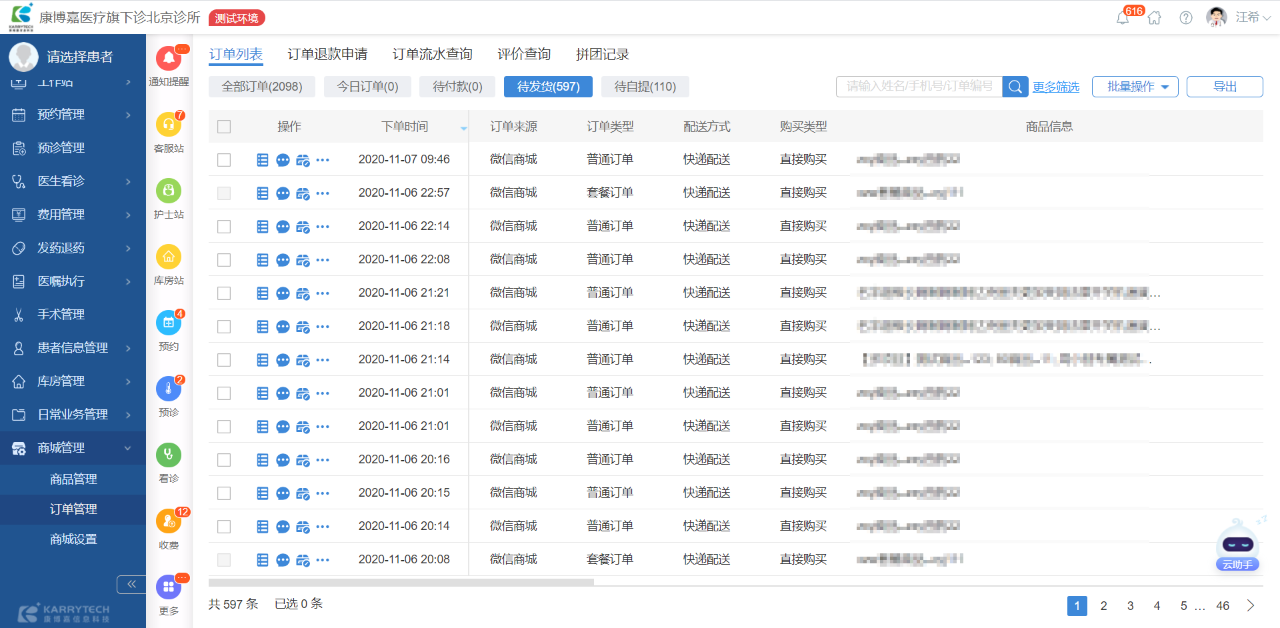 康博嘉云診所醫療軟件精心打磨每一個相關環節,在流程梳理、信息呈現、操作簡化上都力爭做到極致。例如,對于訂單的處理,診所可以在【訂單列表】查詢各個維度的訂單信息,并進行批量操作,縮減處理訂單時間的同時,大大降低出現紕漏的概率。