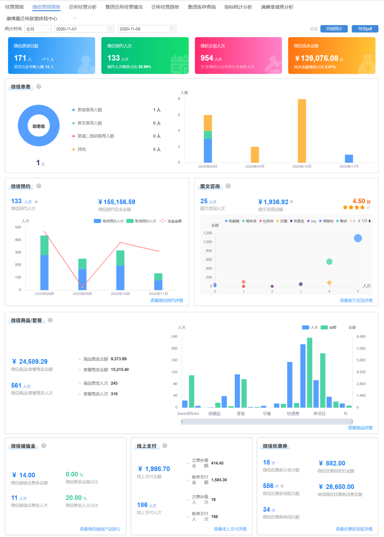康博嘉云診所醫療軟件平臺上強大的數據分析體系,讓靠拍腦袋做決策的時代一去不復返。各項關鍵數據統計、核心指標比對為診所復盤和優化營銷策略提供了有力支持。