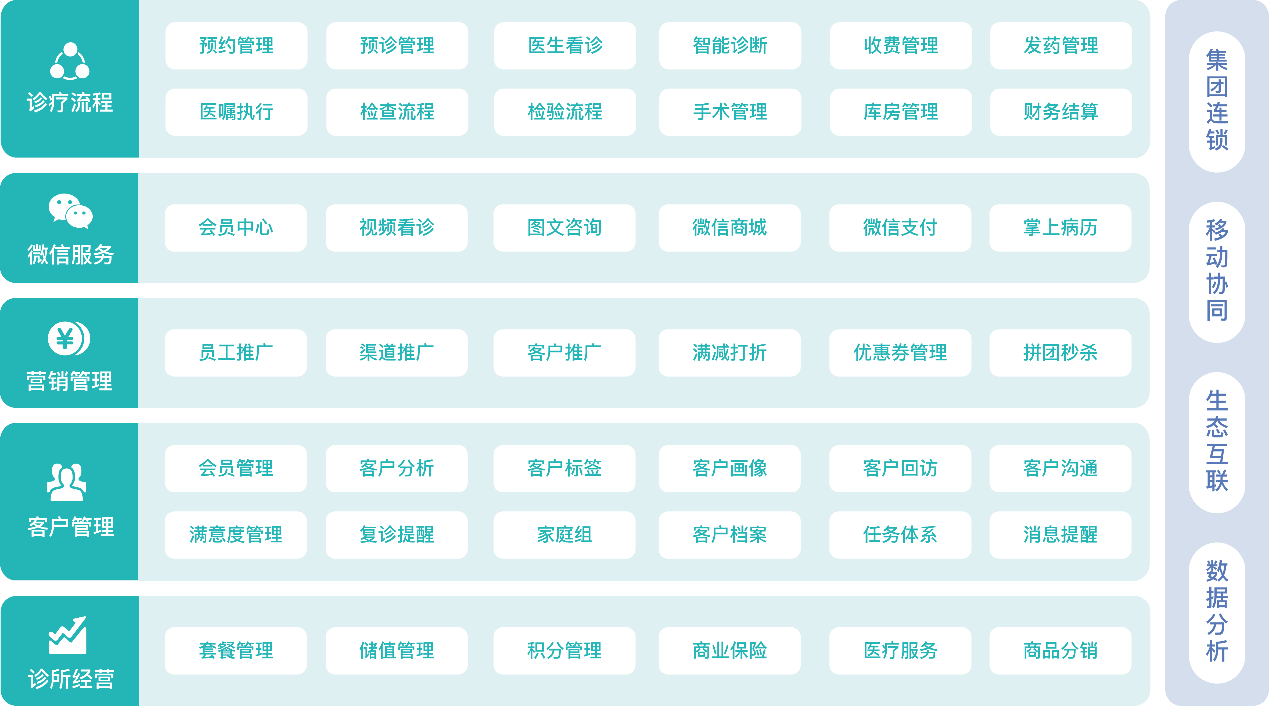 當然,梅奧發展到現在也離不開一個流程完備的信息化工具。我們的診所管理系統,集國內外醫療信息化發展之大成,包括診療流程、診所經營、客戶管理、營銷管理、微信服務等五大基礎版塊,和集團連鎖、移動協同、生態互聯、數據分析四大進階版塊,能夠幫助診所高效處理業務的同時,打造屬于自己的品牌力。
